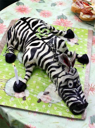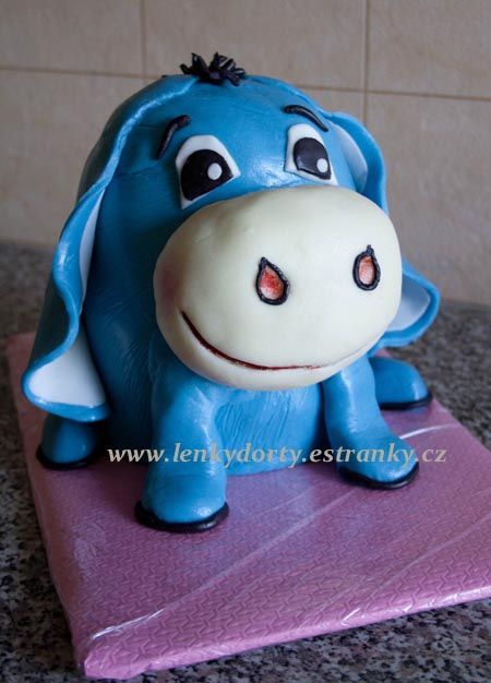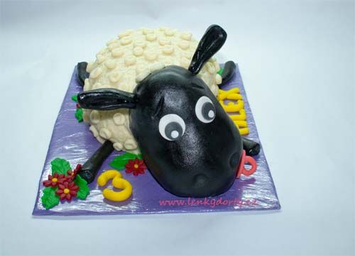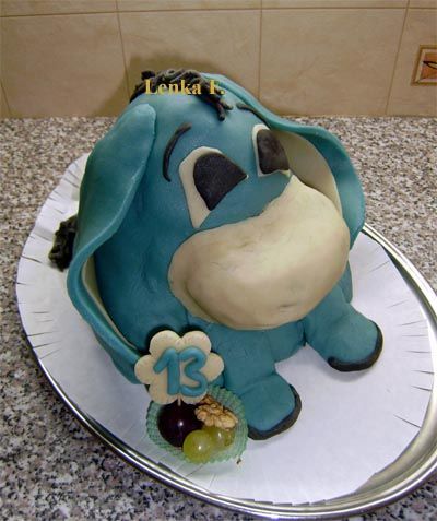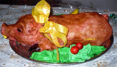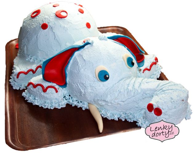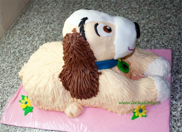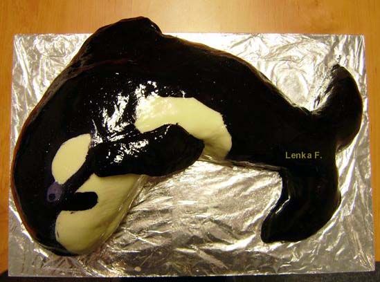 Šlehačkový slon na přání. Klasický korpus, čokoládový krém, banány, čokoládový korpus, vanilkový krém, broskve, vše pravá šlehačka, doplňky marcipán. Délka 70 cm
