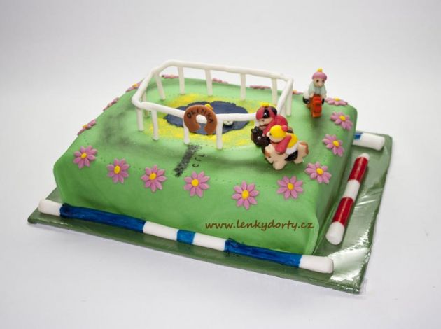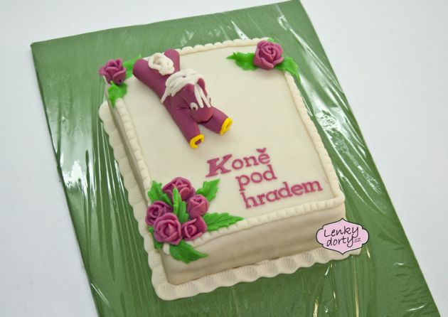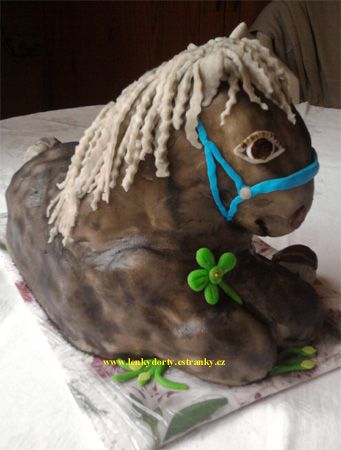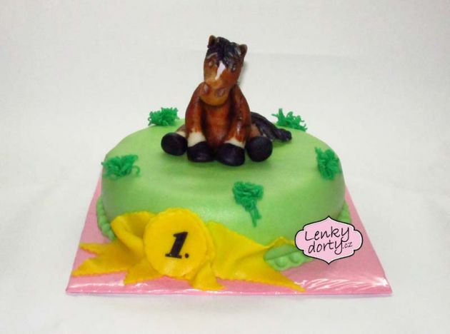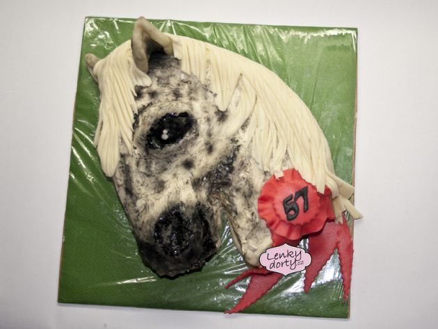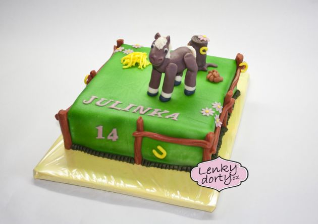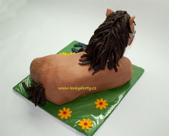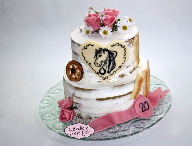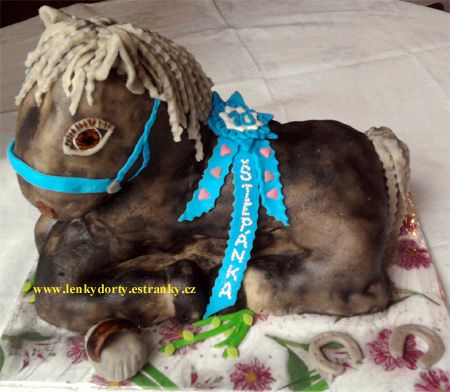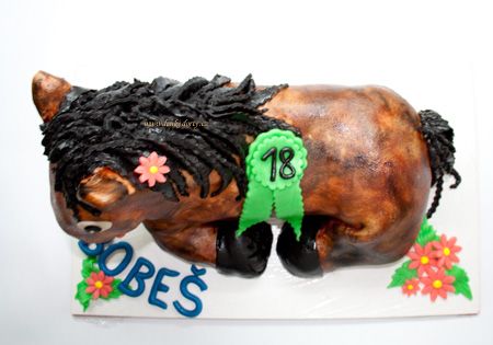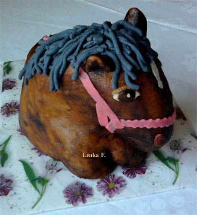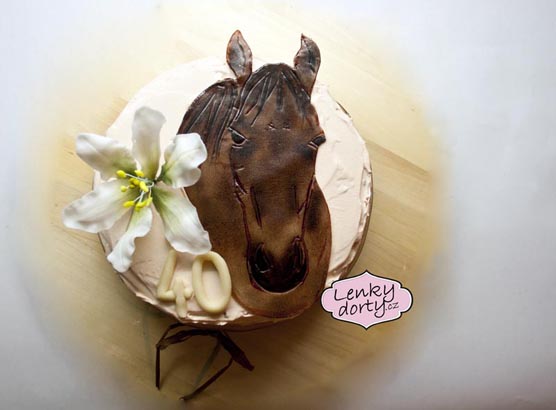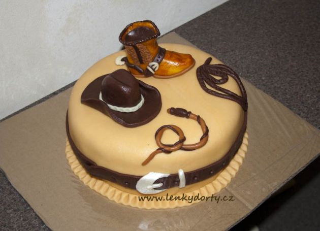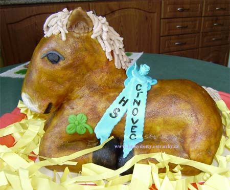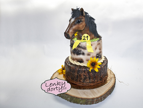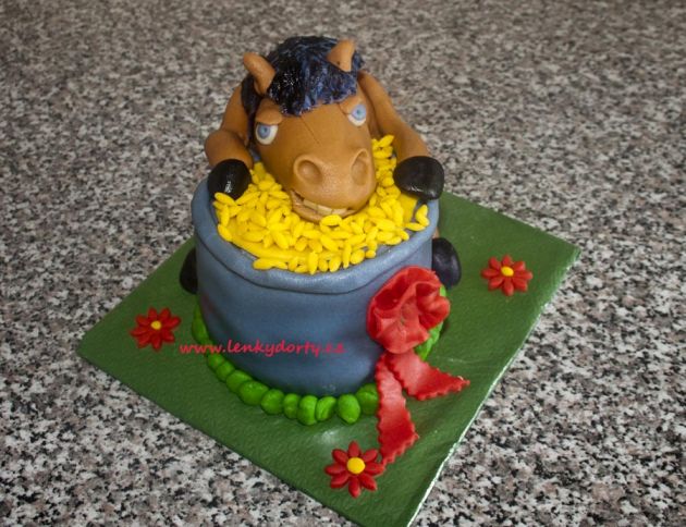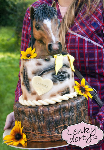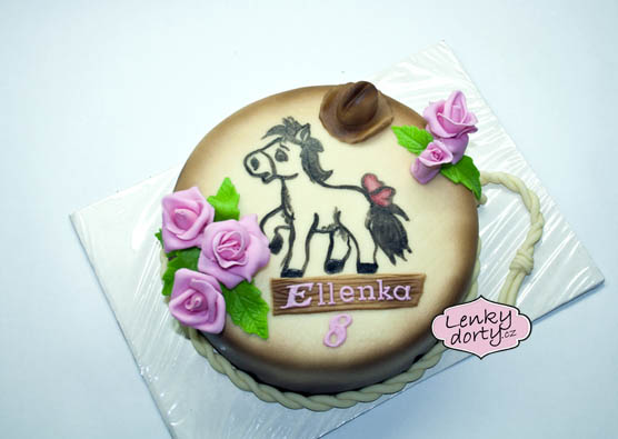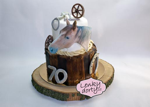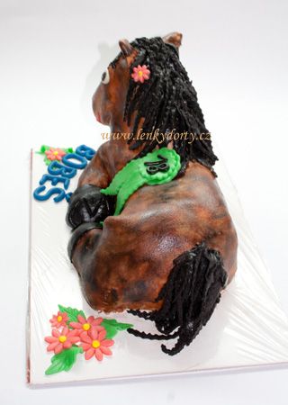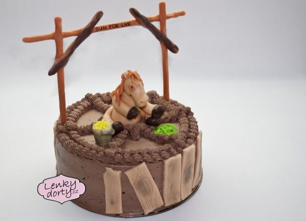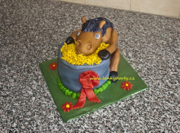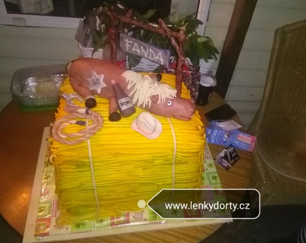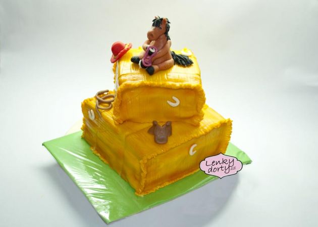 Balík slámy s koněm a westernovou tématikou na oslavu koňáků. Kůň je samostatný dort. Klasický korpus, pravá šlehačka, marcipán, punčovina. Váha přes 25 kg