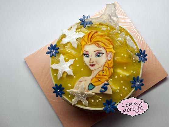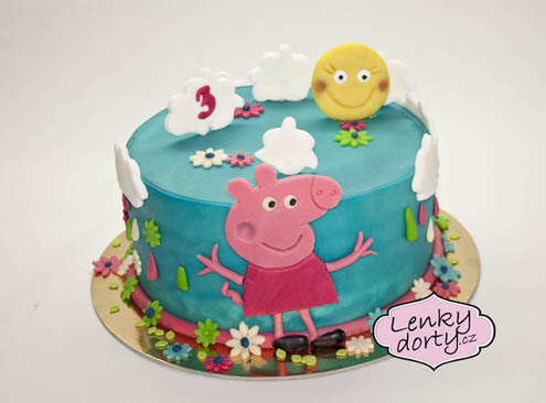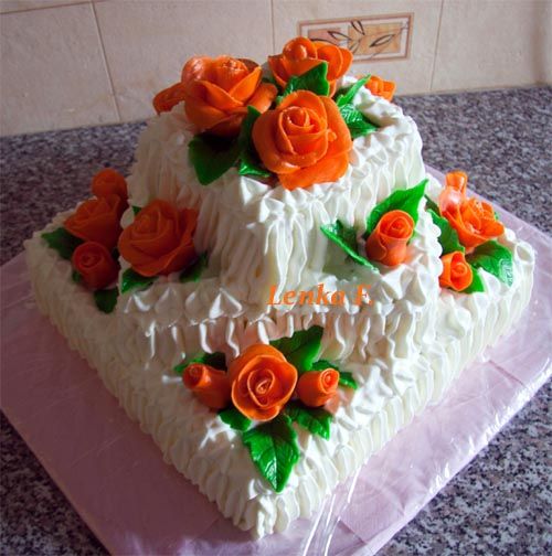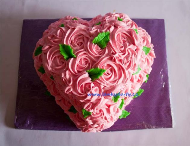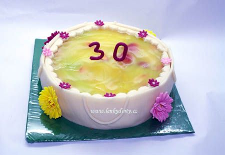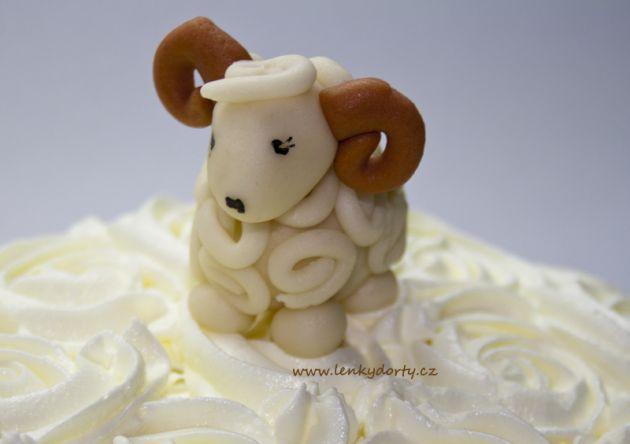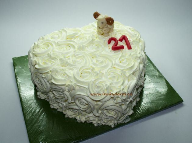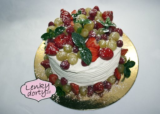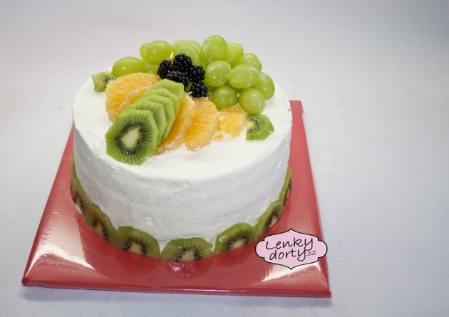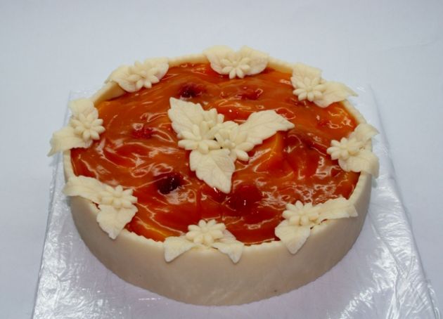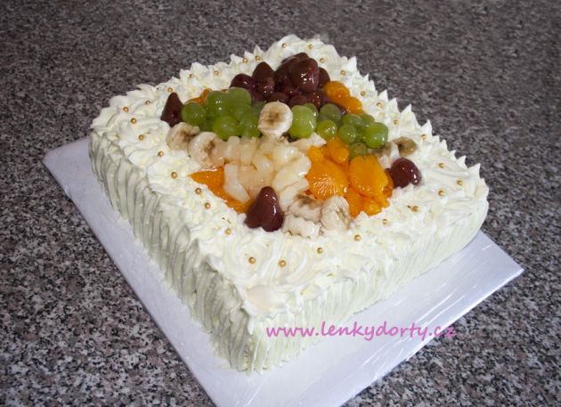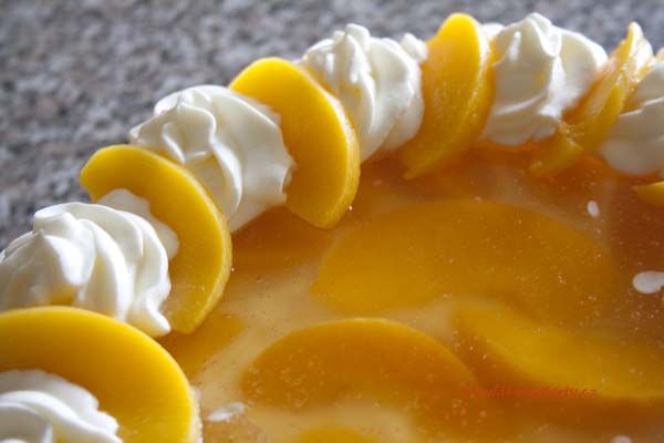 Klasický korpus, pravá šlehačka, broskve, marcipán, průměr 46 cm, váha 9,5 kg